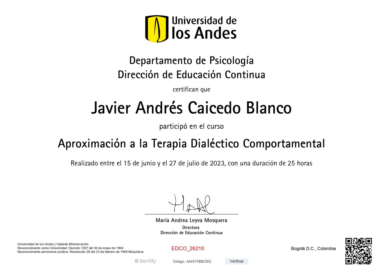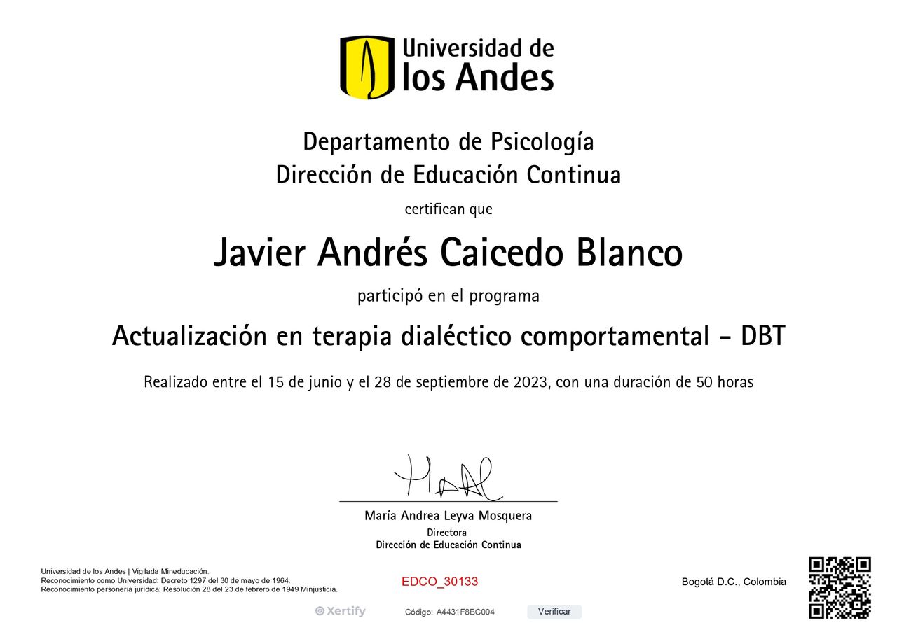 Soy Javier Caicedo Blanco, médico psiquiatra egresado de la Universidad El Bosque, con subespecialización en Psiquiatría de Niños y Adolescentes en la Pontificia Universidad Javeriana. Tengo formación en psicoterapia psicodinámica y entrenamiento en Terapia Dialéctico Conductual (DBT) por la Universidad de los Andes.